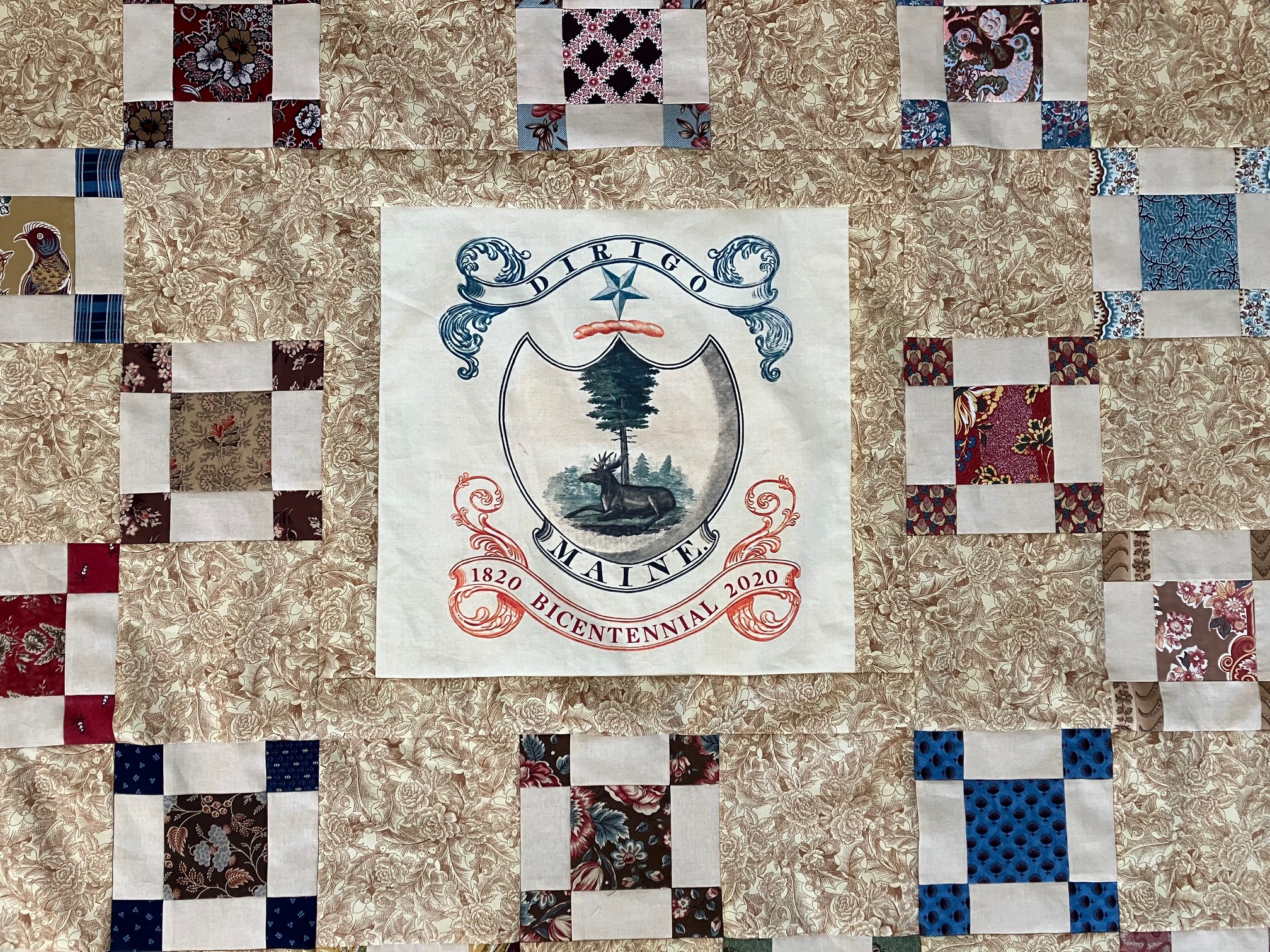 First update: The Maine State Bicentennial Quilt (top). Maine was to celebrate our bicentennial in March of 2020, but I think we all remember what prevented that from happening. Pat Burns drafted the design and members of our quilt study group made blocks. I finally pieced them all together last month! This will be used as a teaching tool at the Maine State Museum when they reopen in 2025. The public will get a chance to learn hand quilting as they enjoy two special quilt exhibitions curated by Laurie LaBar.